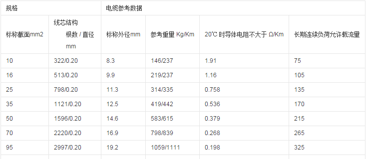 電焊機電纜對應規(guī)格的相關參數(shù)