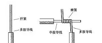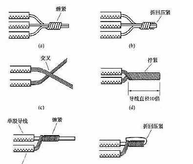 同一方向的導(dǎo)線的連接當(dāng)需要連接的導(dǎo)線來自同一方向時,可以采用圖5所示的方法對于單股導(dǎo)線,可將一根導(dǎo)線的芯線緊密纏繞在其他導(dǎo)線的芯線上,再將其他芯線的線頭折回壓緊即可對于多股導(dǎo)線,可將兩根導(dǎo)線的芯線互相交叉,然后絞合擰緊即可對于單股導(dǎo)線與多股導(dǎo)線的連接,可將多股導(dǎo)線的芯線緊密纏繞在單股導(dǎo)線的芯線上,再將單股芯線的線頭折回壓緊即可。