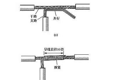 多股銅導(dǎo)線的分支連接多股銅導(dǎo)線的T字分支連接有兩種方法,一種方法是將支路芯線90°折彎后與干路芯線并行[見圖2(a)],然后將線頭折回并緊密纏繞在芯線上即可[見圖2(b)]。