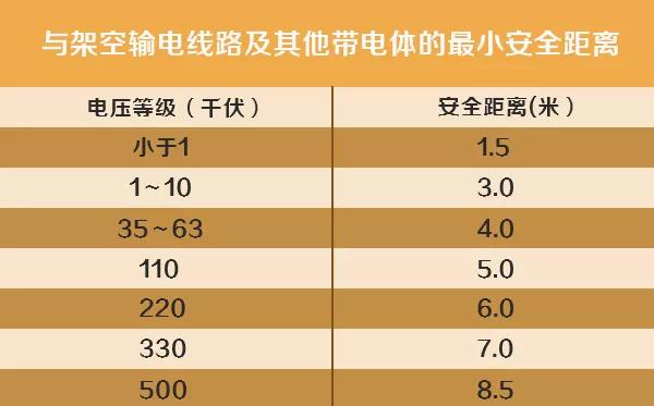 不同電壓等級的高壓帶電線路所必須保持的安全距離,當物體進入這些安全距離時,就會引起放電。根據(jù)《電力設施保護條例實施細則》對安全距離的規(guī)定,1千伏以下高壓線的安全距離為4米;1-10千伏高壓線的安全距離為5米;35-110千伏高壓線的安全距離為10米;154-220千伏高壓線的安全距離為15米。