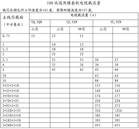 YC電纜:環(huán)境溫度25度,工作溫度65度。